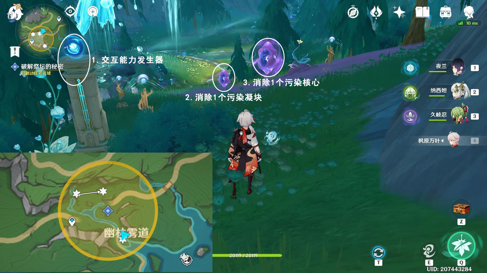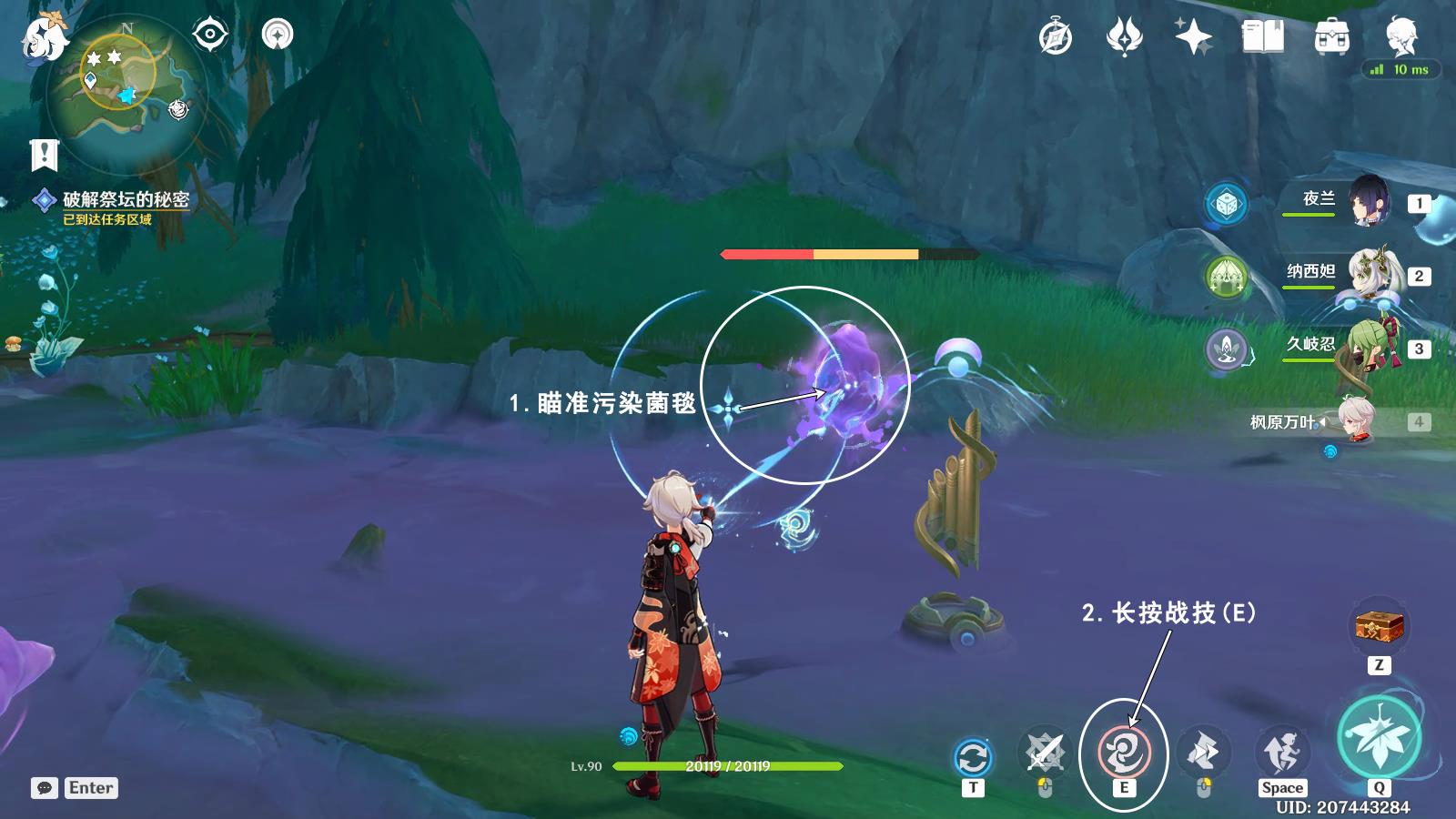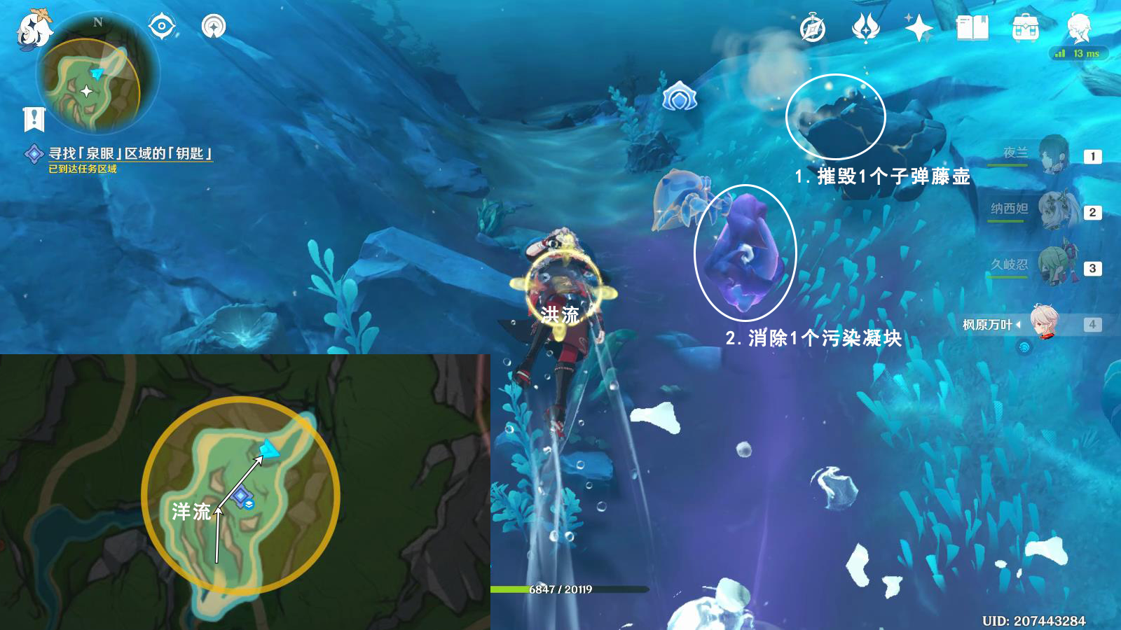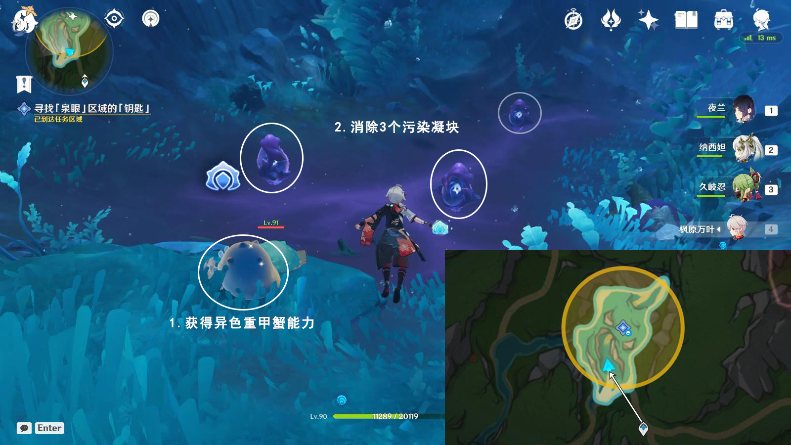 ▶按图中指引数字步骤,消除污染菌毯,击败3个水史莱姆;