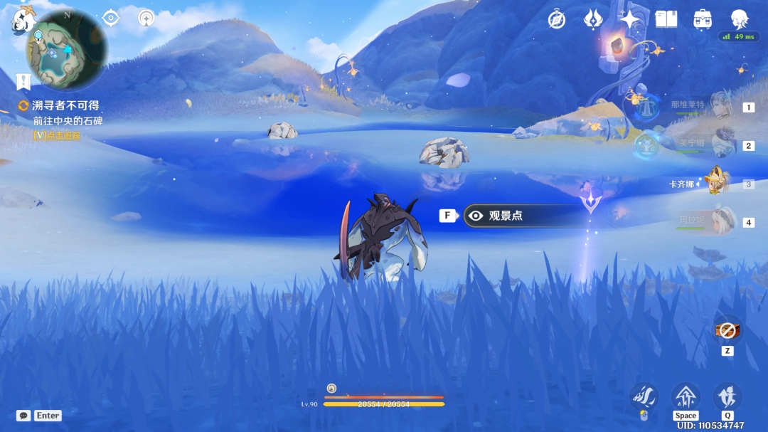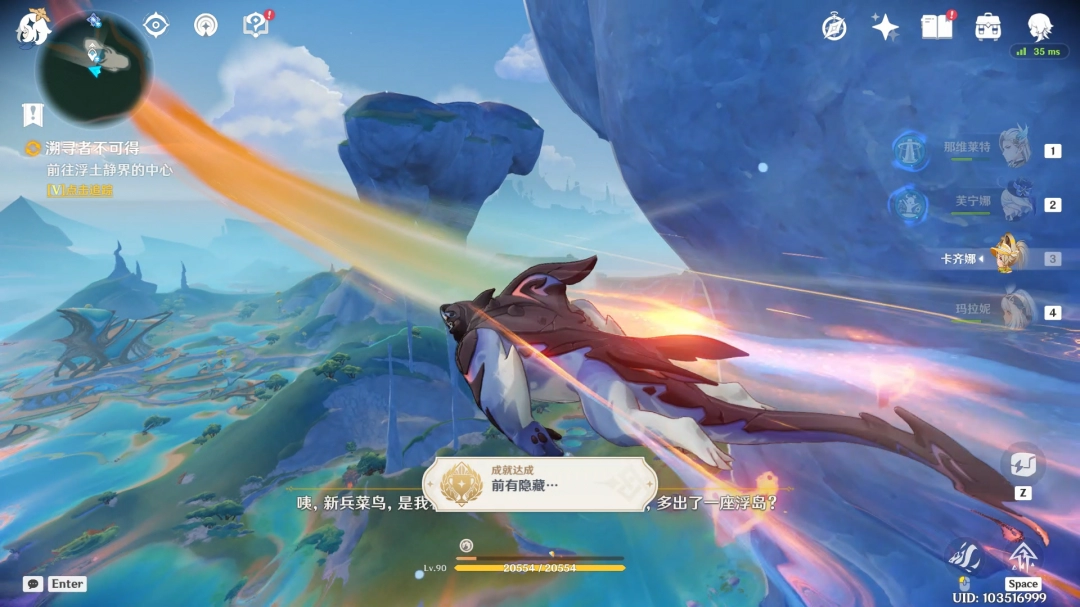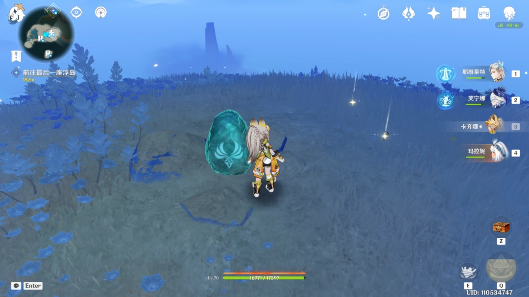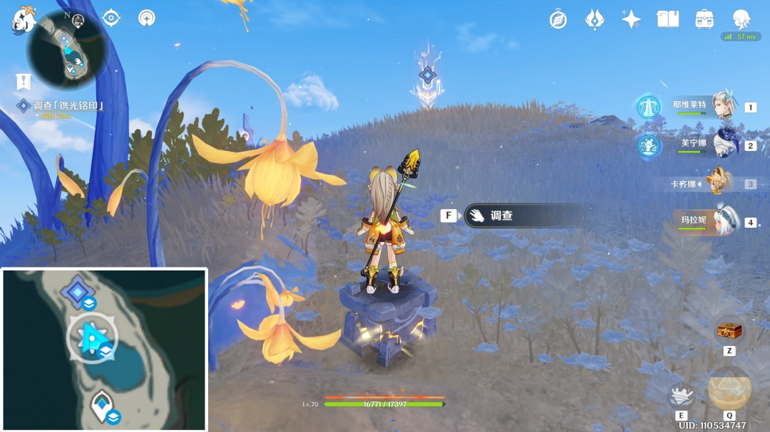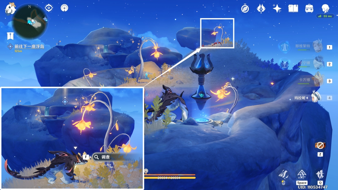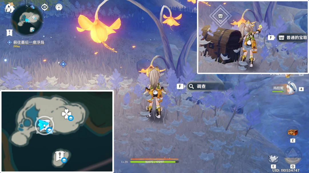 到达终点后会自动解锁一个传送锚点,直接朝着任务点东南方向走到空岛边缘,就能在树下出现调查按钮。