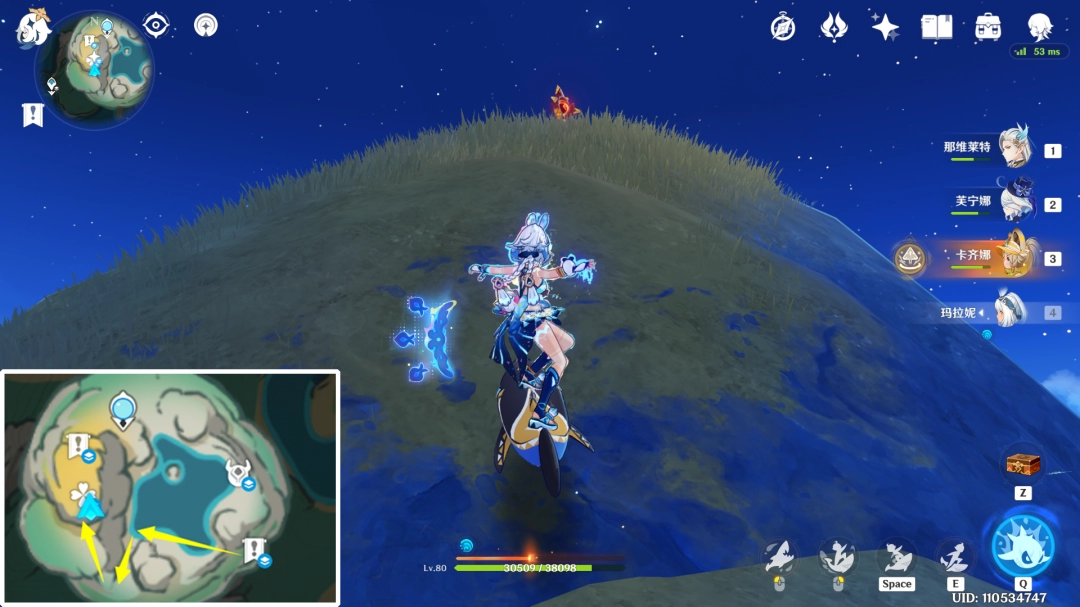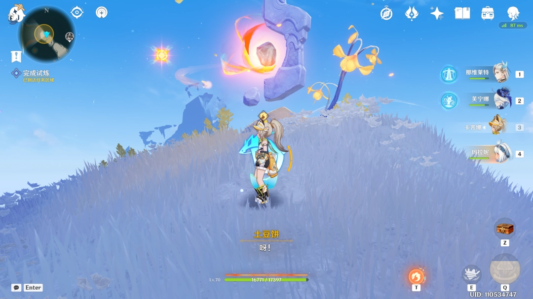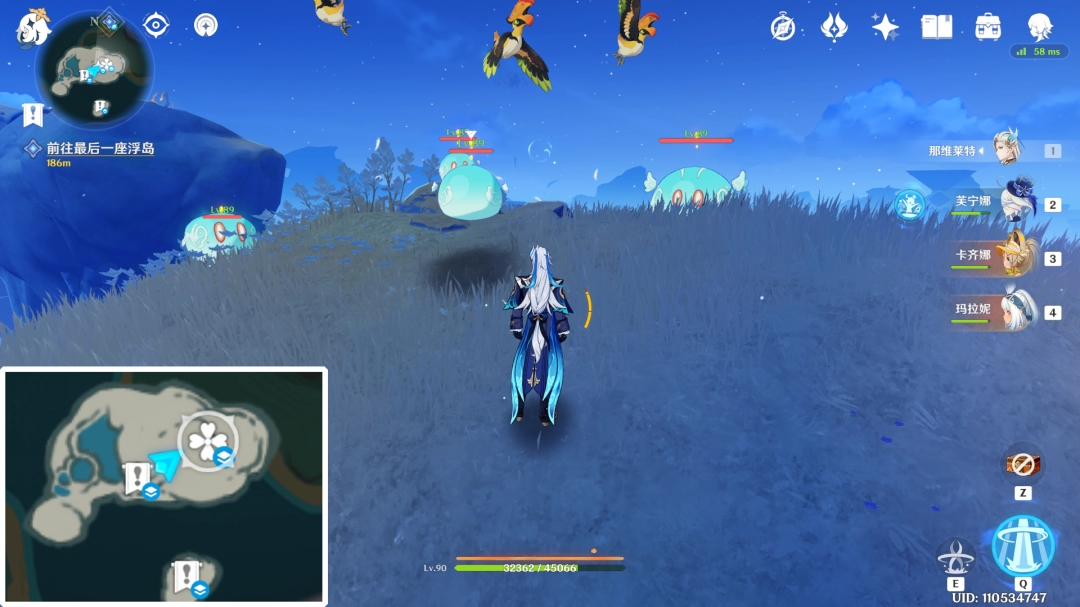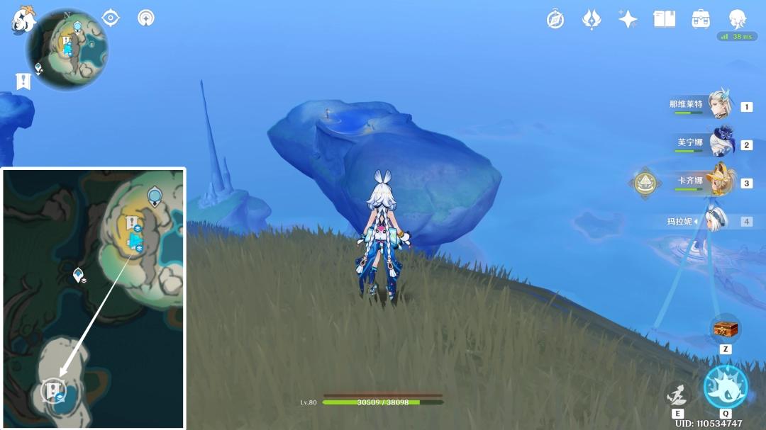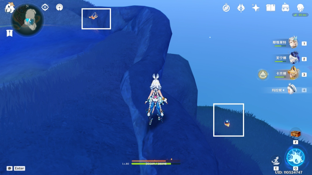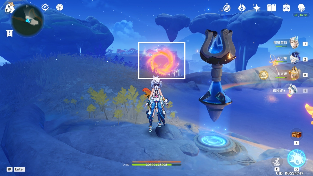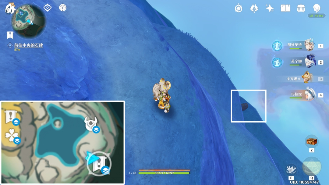 到达终点后会自动解锁一个传送锚点,直接朝着任务点东南方向走到空岛边缘,就能在树下出现调查按钮。