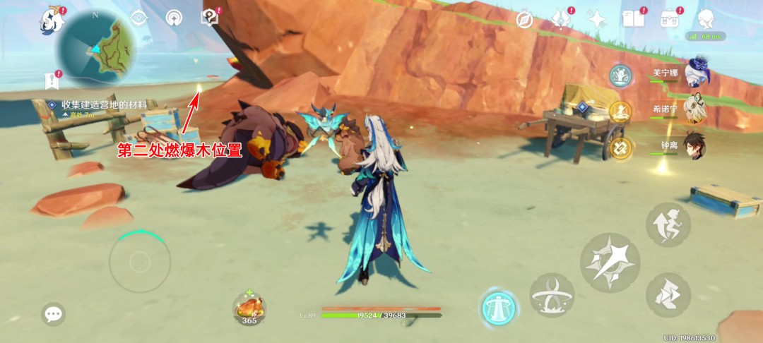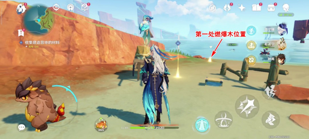 营地附近海边发光点位置,收集此处两个“附近的「燃爆木」”