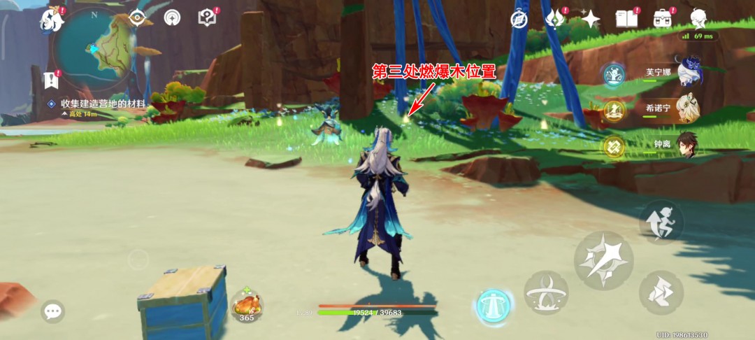 营地东方向山脚下,收集中间发光点的两个爆燃木。其余两处为“灰灰楼林木”,无法凑齐5个木材,可不收集。