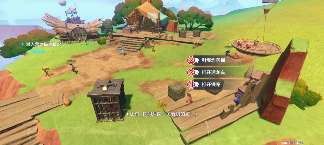 龙伙伴来到营地并触发对话后,依次选择“打开铁笼”“引爆炸药桶”“打开运龙车”后,随后等待龙伙伴完成挑战即可。
