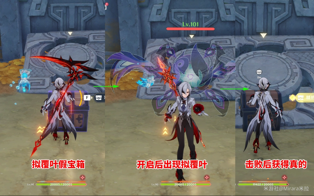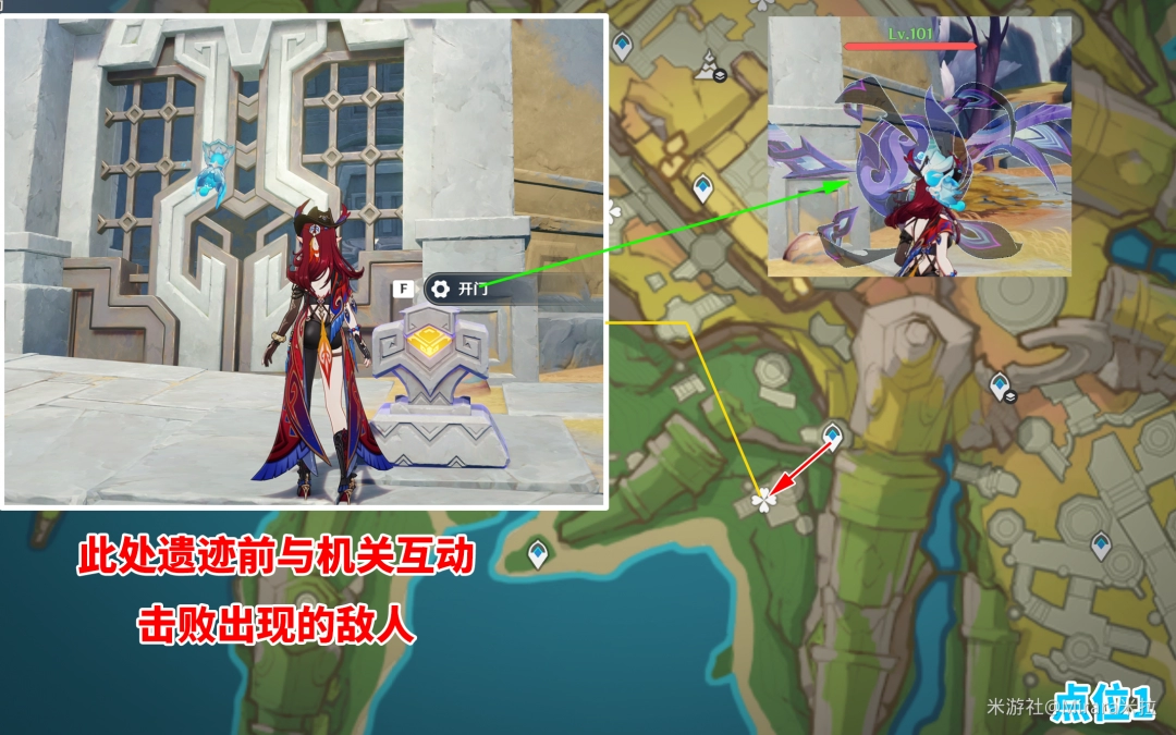 与遗迹前与机关互动,会出现一只「深邃拟覆叶」,击败后开门