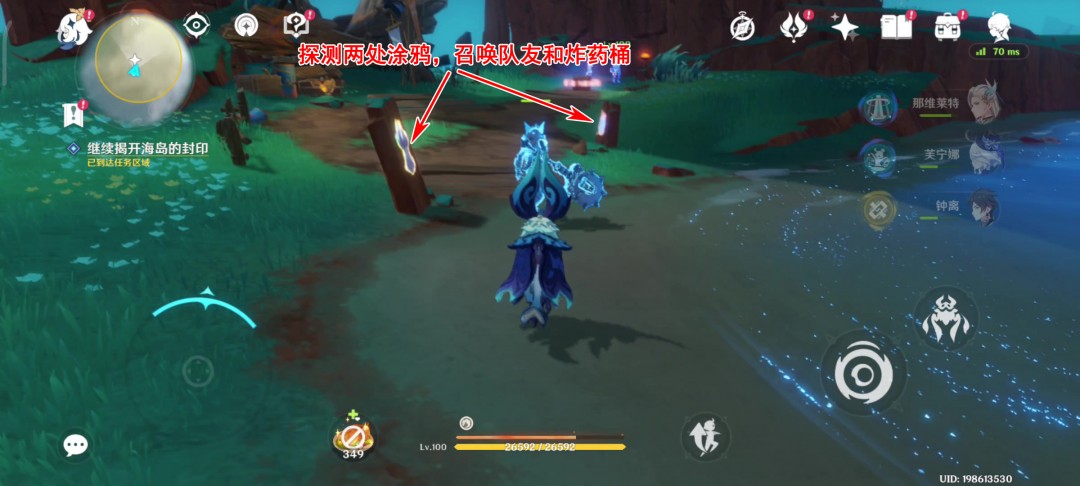2、来到封印位置附近后,探测两处涂鸦召唤“队友”,并利用炸药桶帮助队友击败两个怪物。也可以自己自行击败两个怪物。