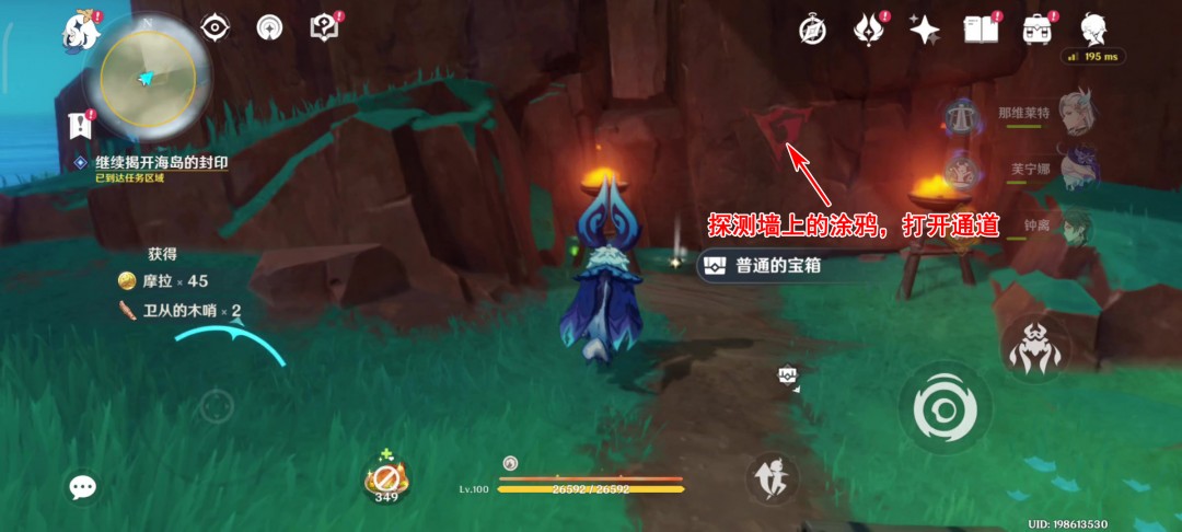 3、击败两个怪物后,探测宝箱附近山壁上出现的涂鸦,进入山洞内部。