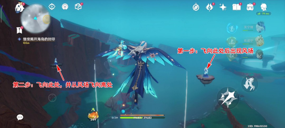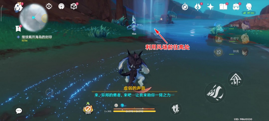 2、跟随任务指引前往第一处指引地点后,靠近出现风场,利用风场前往高处。