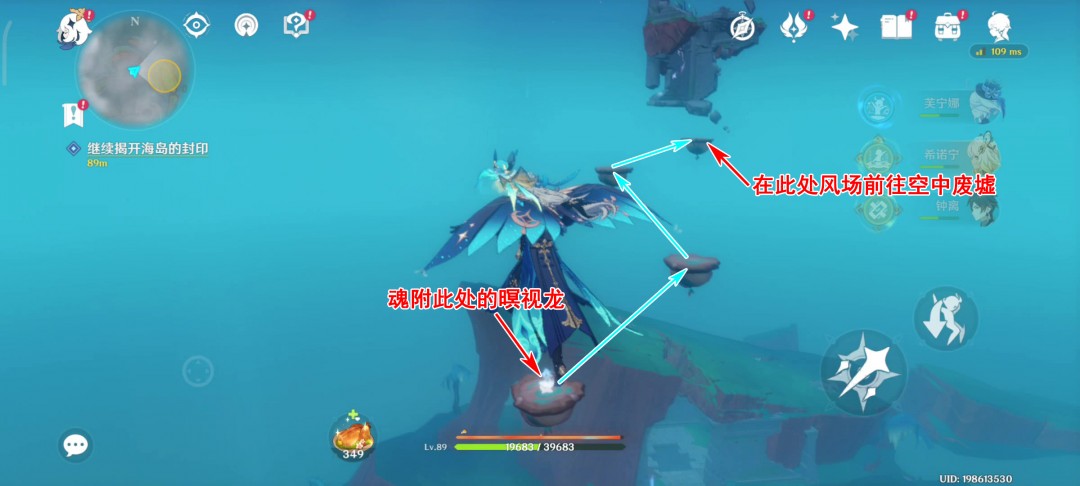 4、来到高处后,魂附下图的暝视龙,利用暝视龙跳跃前往最远处平台,并利用风场前往空中废墟。