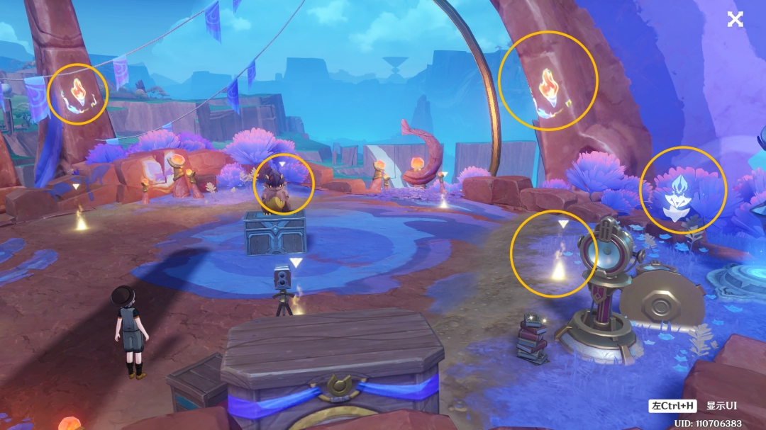 对话后附魂瞑视龙,在下图标记的地点照一下火把,然后在龙宝贝两侧E创建篝火