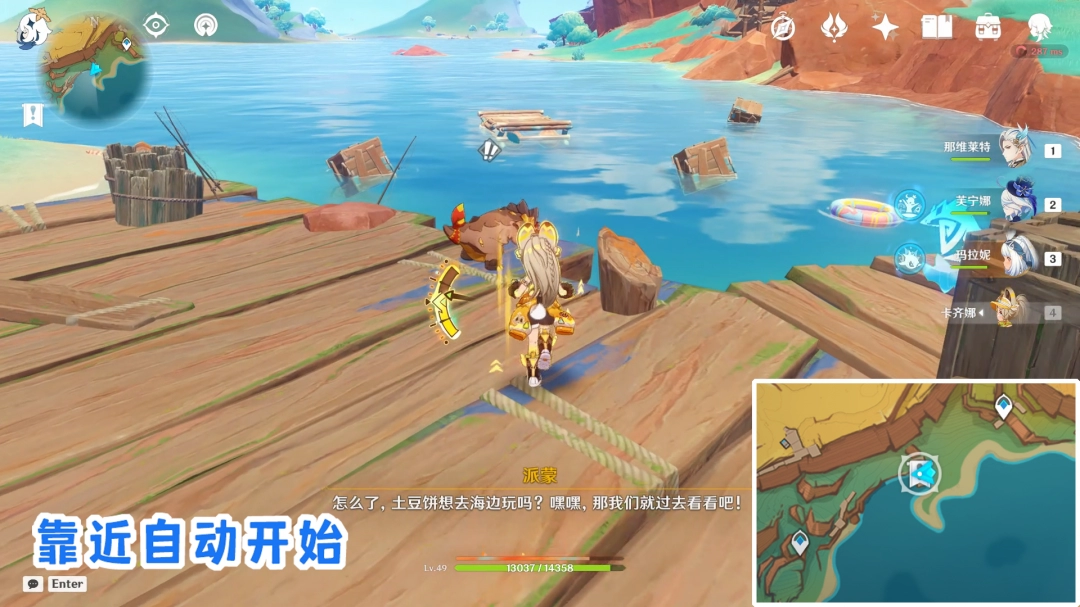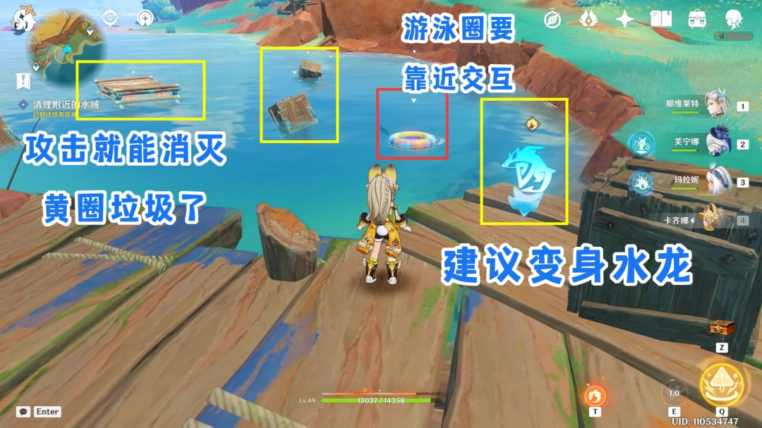 小龙和派蒙想抓鱼,但海边太脏了,先清理附近的水域吧。