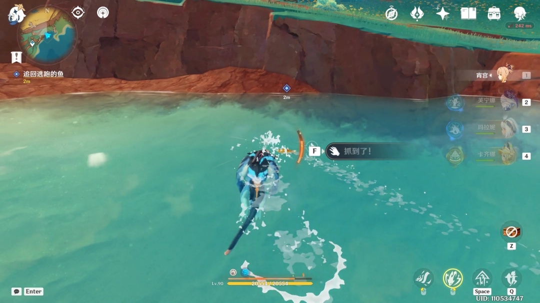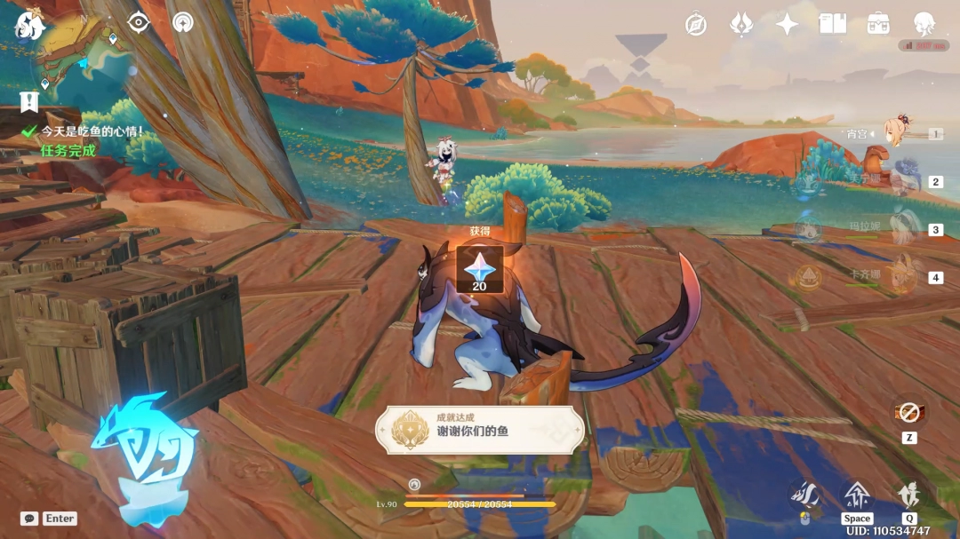 最后将鱼带回岸边,等对话完任务就结束了,获得20原石与成就「谢谢你们的鱼」。