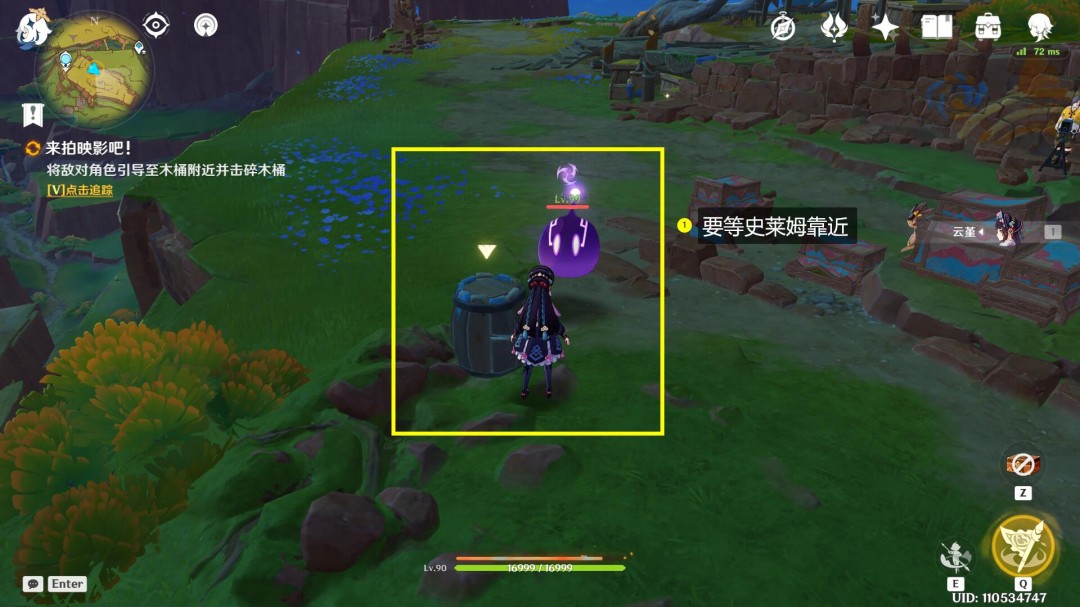 开拍后走到木桶位置,等史莱姆靠近打碎木桶就行
