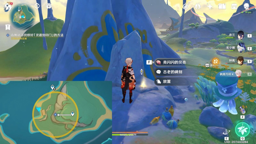 ▶交互古老的碑刻“放置”,交付3个亮闪闪的贝壳;