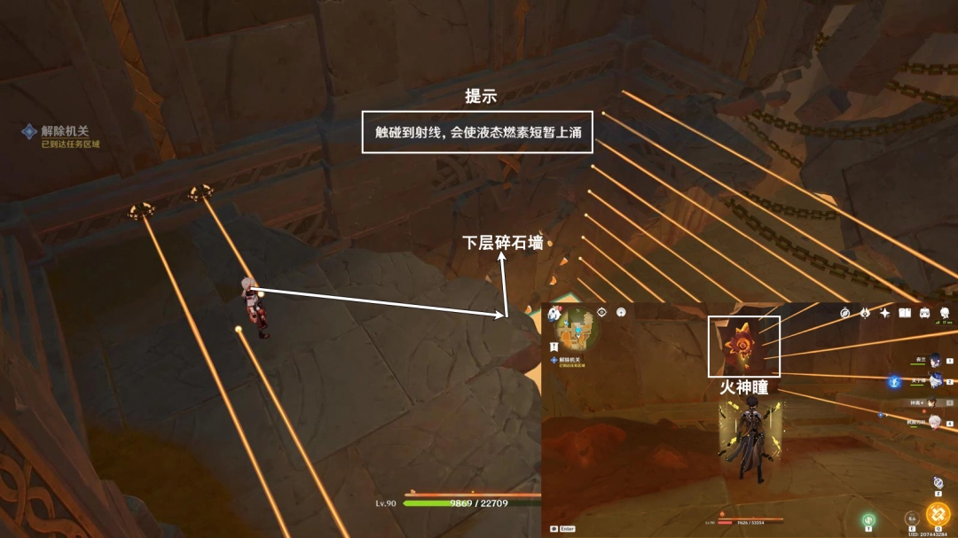 ▶切换岩元素角色,攻击下层碎石墙,获得火神瞳;