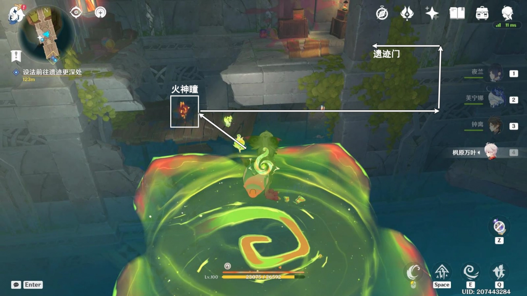 ▶拾取火神瞳,按图中指引路线走,前往遗迹门;