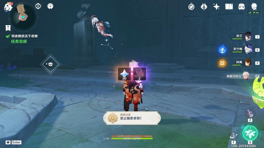 对话结束,完成任务「将夜晚放还于夜晚」,获得成就「禁止随意拿取!」,获得珍贵的宝箱