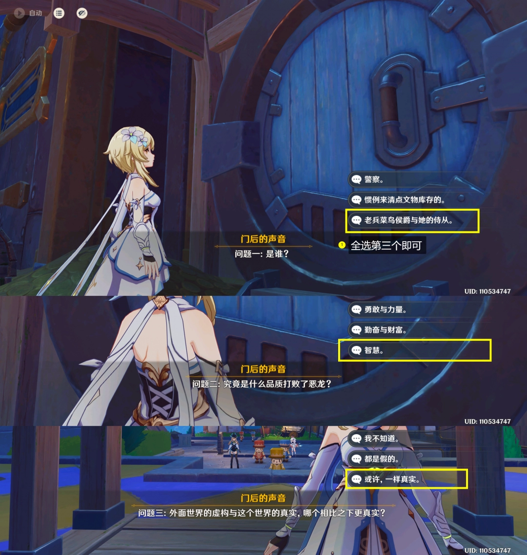 首先需要旅行者通过问答开启大门,选项全选最下面第三个就行。