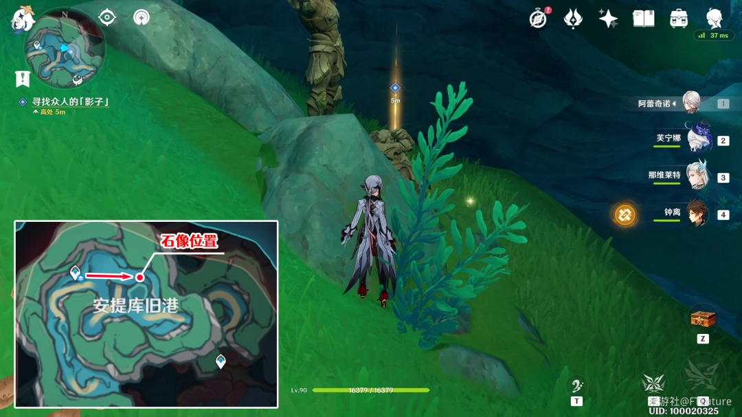 接下来,我们传送到「旧日之海」地图区域的「安提库旧港·上层」,到图示位置靠近石像即可触发后续剧情。