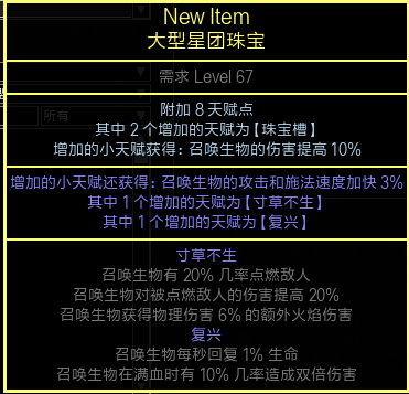 大型召唤生物伤害*2,复兴+寸草不生+3%攻速是理想状态,一般情况,复兴+寸草不生即可。开荒单复兴也可以顺滑。8天赋--12天赋的,如果在有攻击速度%情况下,等级接近100级,可以考虑星团选择12天赋左右的。收益大于任意天赋点给的伤害。