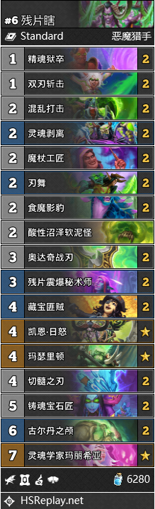 在补丁前的环境里,残片瞎在解场与伤害上的高绝对强度使其成为了环境定义者中的重要一员,其余部分职业也存在着和残片瞎游戏策略相近的卡组,但可能因为单卡强度不如残片体系,致使众多武器直伤卡组中残片瞎的热度一直稳居高位;在补丁后,由于动物保镖的削弱,残片瞎的劣势对局即各种形态德鲁伊的热度锐减,可以说从这种层面来讲,环境变得对于恶魔猎手更加有利;残片瞎因为自身的强度达标以及对局时长适中,依然是多数玩家快速冲击传说的首选卡组之一。然而不能忽略的是几周以来,包括圣契骑与光铸骑在内的各种形态骑士的热度在逐节攀升,目前环境中需要注意的是在部分分段避开圣骑士的猛烈追击。