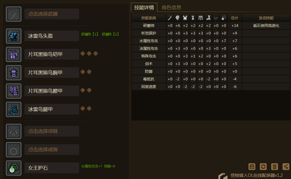冰、雷、龙三属性有两件防具相互通用。冰、雷属性套装成本较低,龙属性较高。护石均为初始+5的女王护石。
