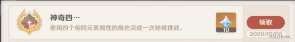 使用四个相同元素的角色完成一次秘境挑战即可,注意不能组队完成