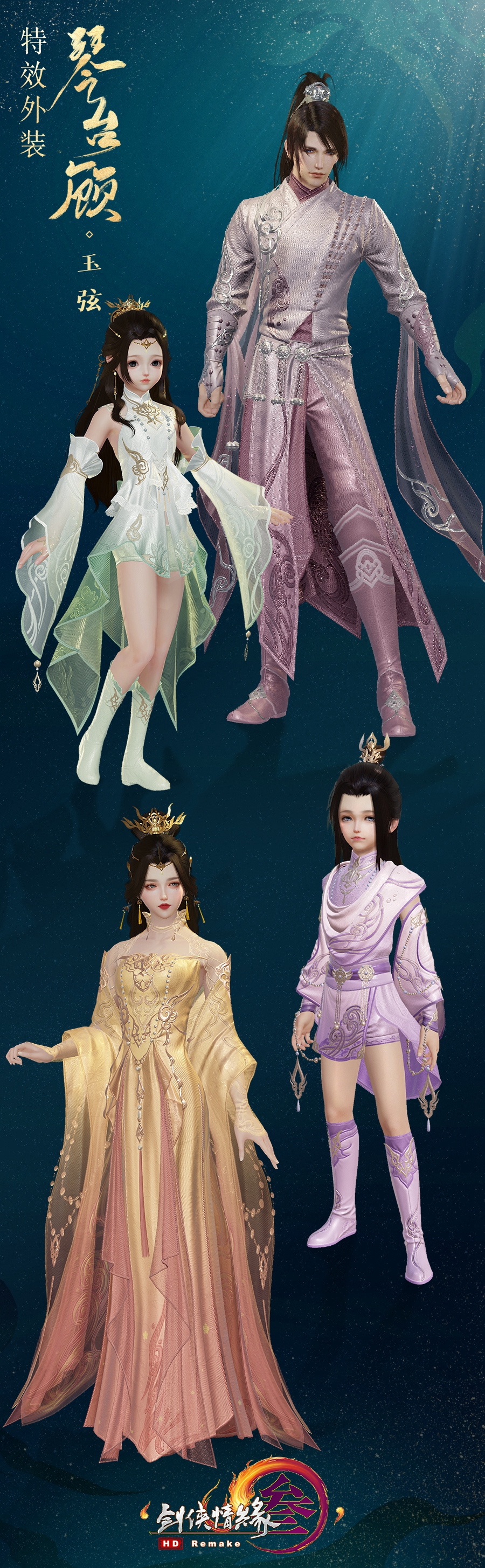 本次推出的特效外装“琴台顾”款式优雅,布料精致,更有四款偏色可供侠士选择!成女款一袭长裙凸显身姿,配色雅致,佐以金饰点缀,低调内敛的同时彰显贵气。袖摆飘飘,绣纹精致,如烟缥缈更显飘逸,又好似水波粼粼更觉素雅。萝莉款则采用俏丽的短裙,裙摆好似燕尾,层层叠叠又如同波浪,富有生趣,将稚童生机活泼的特点彰显出来。成男款沉稳大气,金饰状如祥云,装点于两臂,衣摆暗绣云纹凸显侠客恣意潇洒的江湖意气,腰间精巧的铃铛则为整体增添一分趣味。正太款则选取颇具孩童气的短裤,金饰精巧不繁复,搭配海浪绣纹,将少年侠者志在四方的伟大志向尽数展现。
