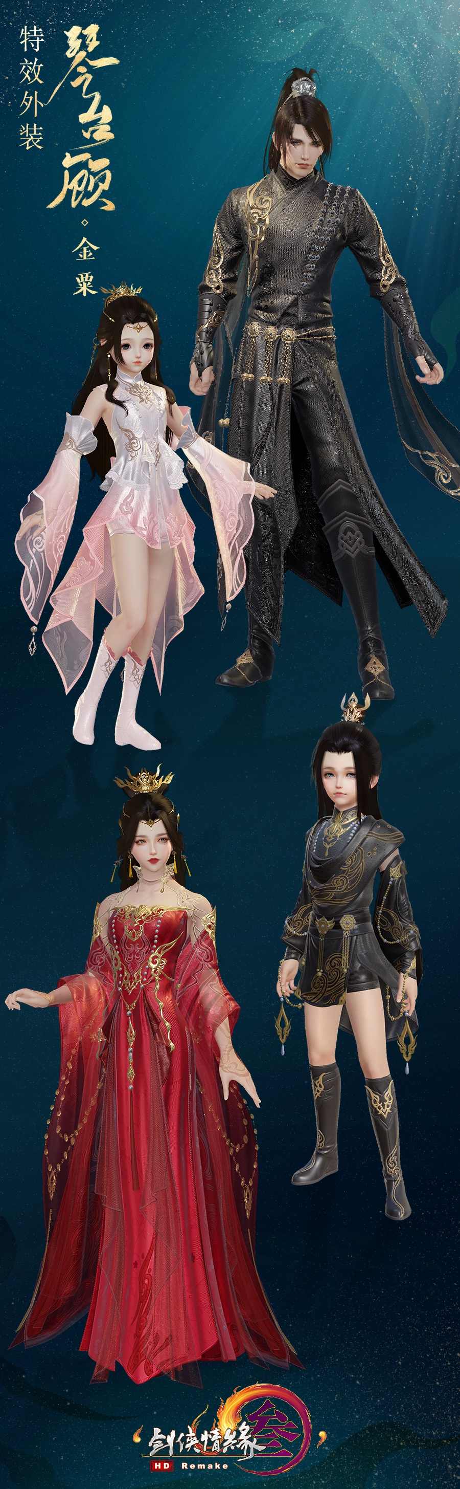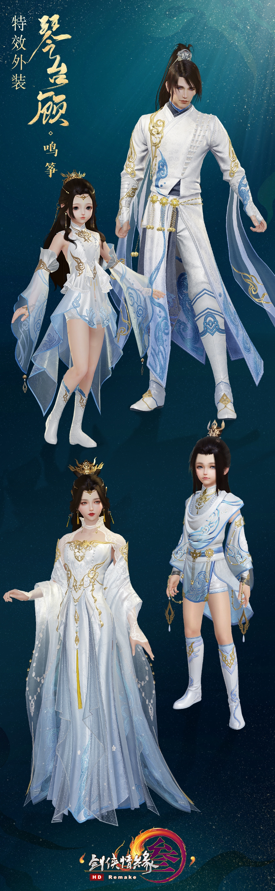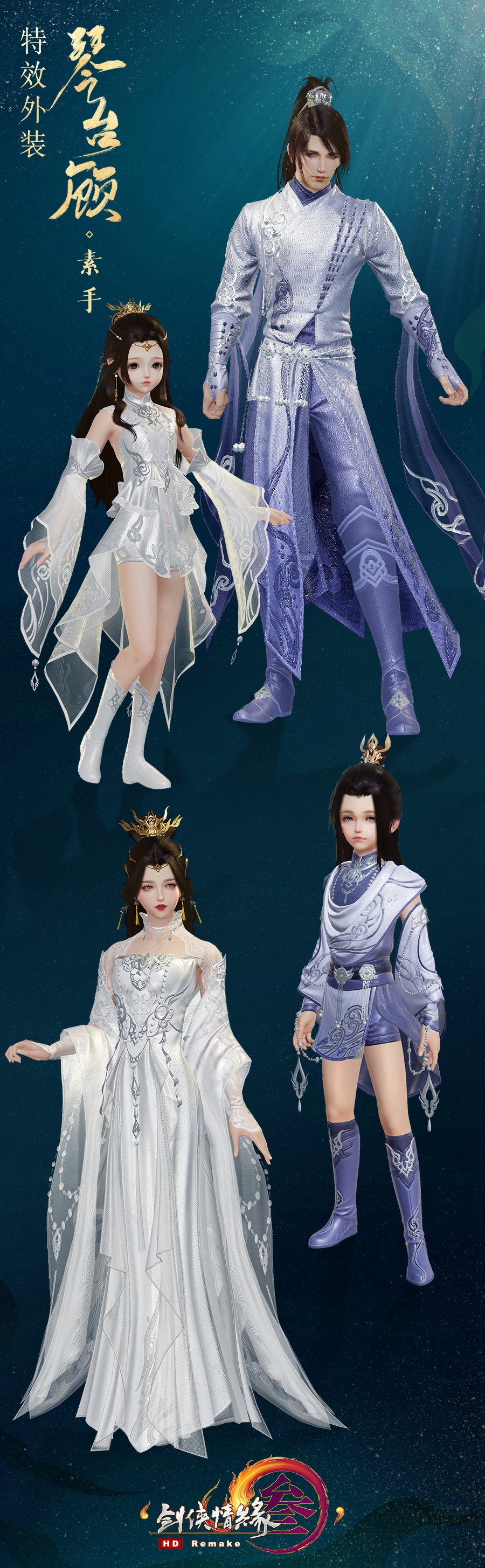 本次推出的特效外装“琴台顾”款式优雅,布料精致,更有四款偏色可供侠士选择!成女款一袭长裙凸显身姿,配色雅致,佐以金饰点缀,低调内敛的同时彰显贵气。袖摆飘飘,绣纹精致,如烟缥缈更显飘逸,又好似水波粼粼更觉素雅。萝莉款则采用俏丽的短裙,裙摆好似燕尾,层层叠叠又如同波浪,富有生趣,将稚童生机活泼的特点彰显出来。成男款沉稳大气,金饰状如祥云,装点于两臂,衣摆暗绣云纹凸显侠客恣意潇洒的江湖意气,腰间精巧的铃铛则为整体增添一分趣味。正太款则选取颇具孩童气的短裤,金饰精巧不繁复,搭配海浪绣纹,将少年侠者志在四方的伟大志向尽数展现。