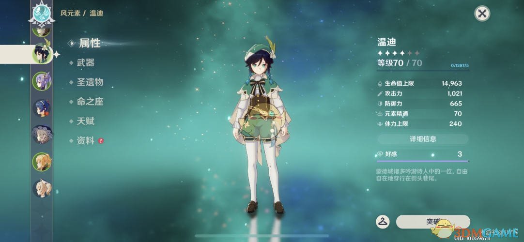 4.温迪。同样没有什么好说的,值得注意的是别学我拉到70。低于世界等级限制20-30都行。充能至少160以上。必抽必练