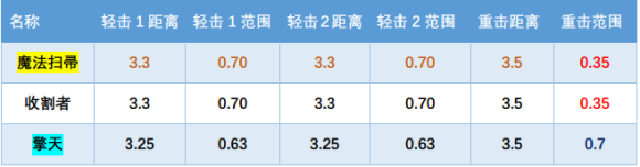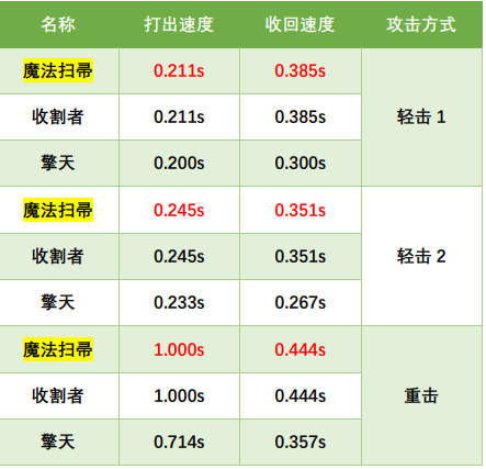 我们可以发现魔法扫帚和收割者仍然是一模一样的数据!具体表现为切换速度、轻击速度都还可以,但是,重击速度偏慢,达到了1秒。要知道,这个速度已经在刀战中很弱势了,更何况重击的范围也不大,容易出现打空的情况,而在全民AC普及的情况下,重击无疑使用价值远超轻击。恰恰重击比较弱,那么也注定了这款扫帚难占一席之地。
