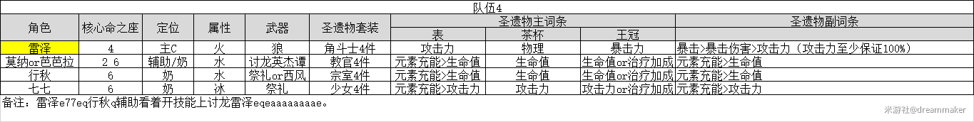 这套整容目前算是比较成熟的体系,核心就是保证雷泽的生存,输出只能说是一般,但是泛用性确实很好。没有77可以那凯亚代替。这里还要说一下水雷感电是可以同时附着2中元素不消失的,所以打这套队伍高频雷和高频水配合低频冰是最优搭配。