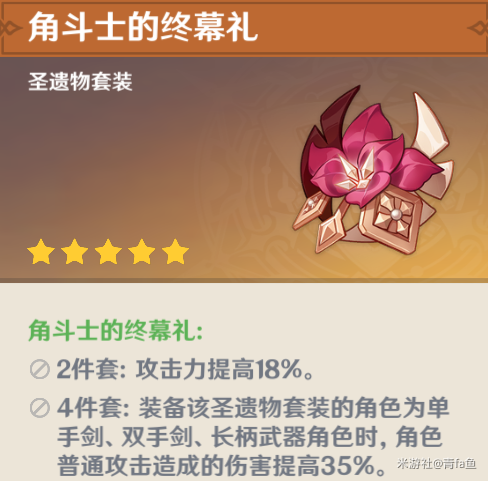 角斗士两件套的效果属于万金油,四件套效果则非常契合雷泽, 虽然狼魂的伤害吃不到这个加成,但雷泽大部分伤害来自于普通攻击的物理输出,无伤大雅。