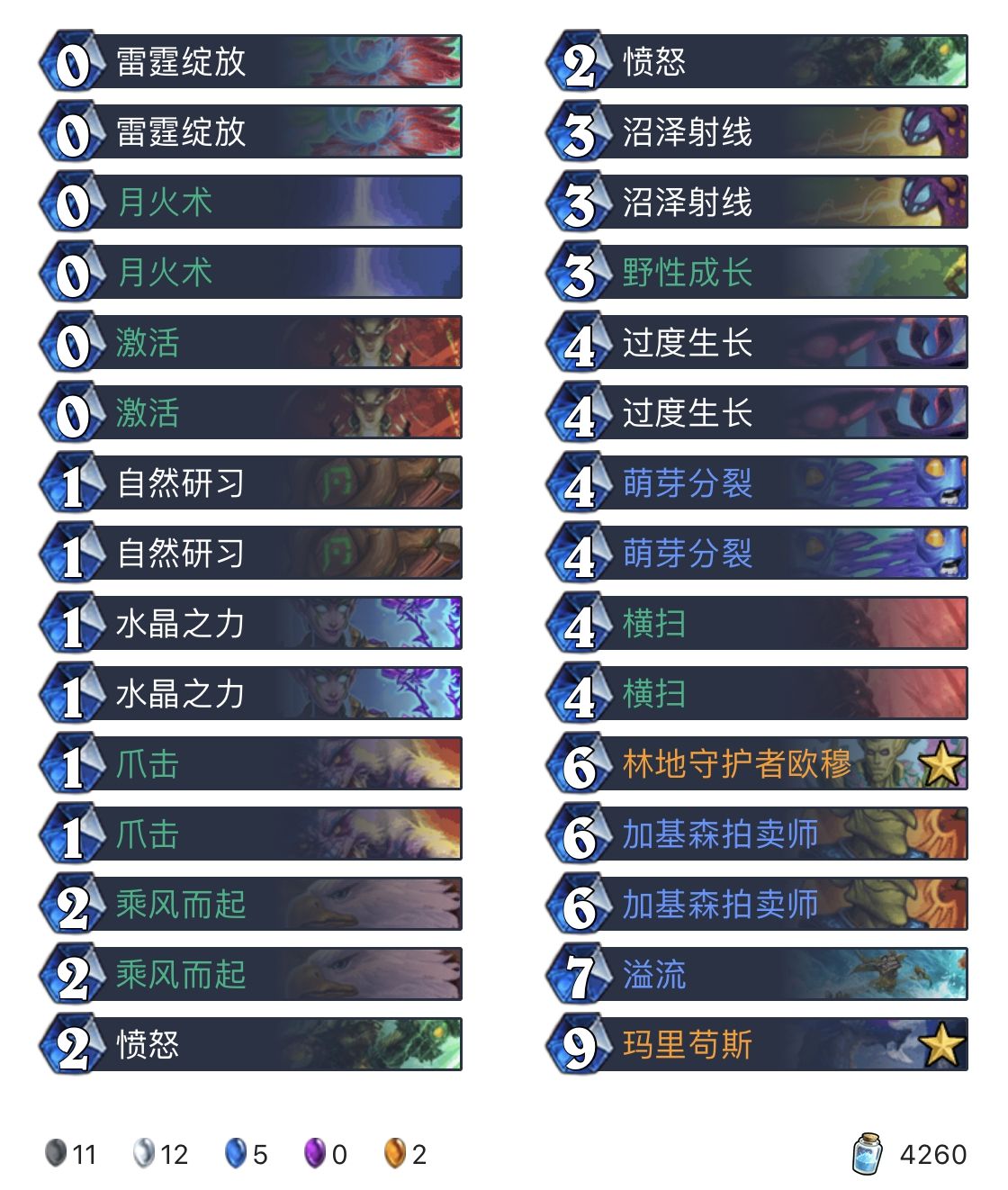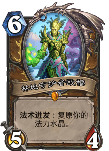 炉石传说2021蓝龙德卡组玩法:前期通过激活、雷霆绽放、过度生长等跳费手段,中期通过加基森拍卖师大量过牌,凑齐关键牌,在有10个水晶(手里有激活、雷霆绽放可酌情减少)的时候,先下林地守护者欧穆,然后萌芽分裂林地守护者欧穆,接下来下玛里苟斯,再打0—1费法术复原水晶,最后完成斩杀。