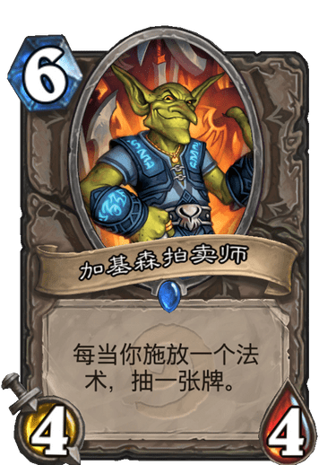 核心启动卡之一,因为带了两张,有时可以复制场上的一张加基森拍卖师,加速过牌与抗一点伤害都可以,打牌要临场而变,不要死板教条。