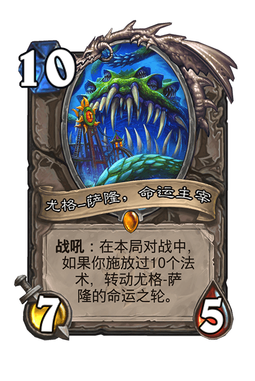战吼:在本局对战中,如果你施放过10个法术,转动尤格-萨隆的命运之轮。