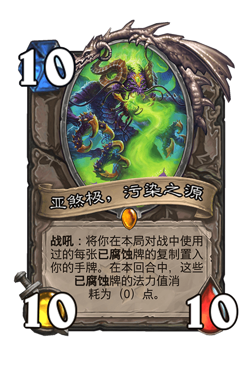 战吼:将你在本局对战中使用过的每张已腐蚀牌的复制置入你的手牌。在本回合中,这些已腐蚀牌的法力值消耗为(0)点。