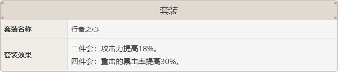 行者之心可以在提升面板的同时增加重击的暴击率,提高火花无限的触发频率。