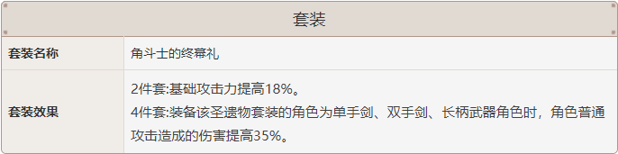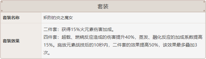 在游戏后期,玩家可以在魔女4、魔女2+角斗2、乐团4之间进行选择,魔女4件可以有效提高可莉的输出上限,魔女2+角斗2相对于魔女4伤害上限要低一些,但整体输出曲线非常平滑,适合驻场玩法选择,乐团更适合频繁触发元素反应和使用重击较多的速切玩法。