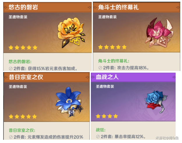 与大多数输出型角色类似,这种2+2的套装整体而言上限不高但通用性较强,主要体现在磐岩两件套与角斗士两件套上。