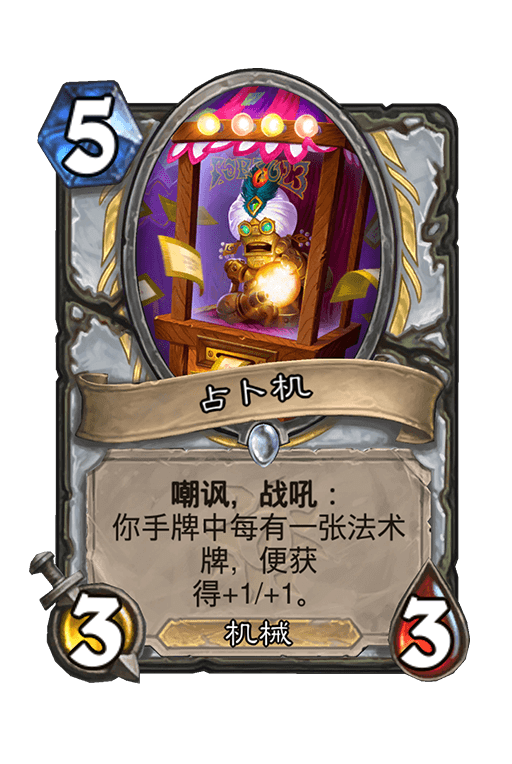 炉石传说新版本“疯狂的暗月马戏团”终于上线了,在这次的新版本卡套中有很多新的卡组,其中里面就有占卜机这个卡牌,那么炉石传说疯狂的暗月马戏团新卡中的占卜机怎么样呢?今天小编就给大家带来炉石传说疯狂的暗月马戏团占卜机卡牌介绍,大家一起来了解一下吧!
