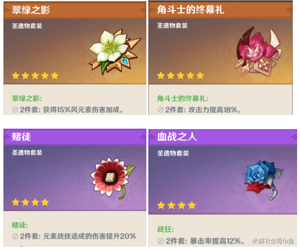 其他如风套四件套的效果侧重点是扩散伤害的提升以及辅助减抗,这里对于输出琴在双风体系中主打风伤来说,并不合适,所以不是很推荐。