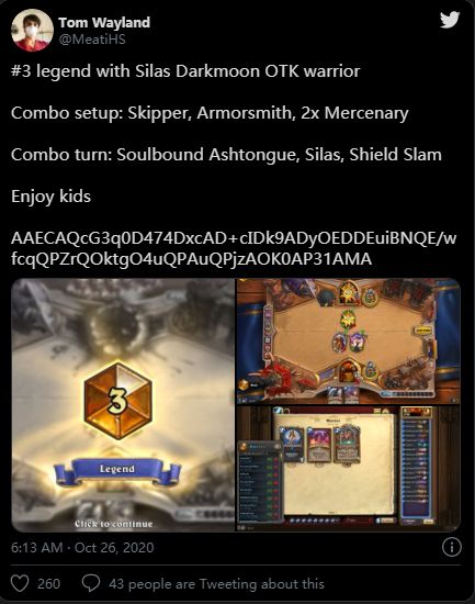 来自外服玩家Tom Wayland,最高打到了第3名。(严重怀疑用其他卡组打到了前几,用这套赢了一把到了第3)