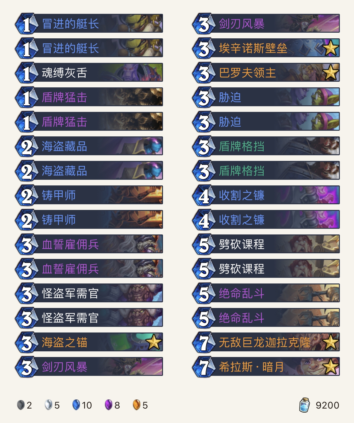 启动方式想必大家都懂了,就是暗月将灰舌送给对面,盾猛打灰舌斩杀,前几天狗贼叔叔在玩的套路,不过叔叔是玩的狂野基数otk,这套是标准。个人感觉也只能当娱乐卡组,想要顺利叠30甲可能有点难度,上分估计难,还是拿去娱乐好。