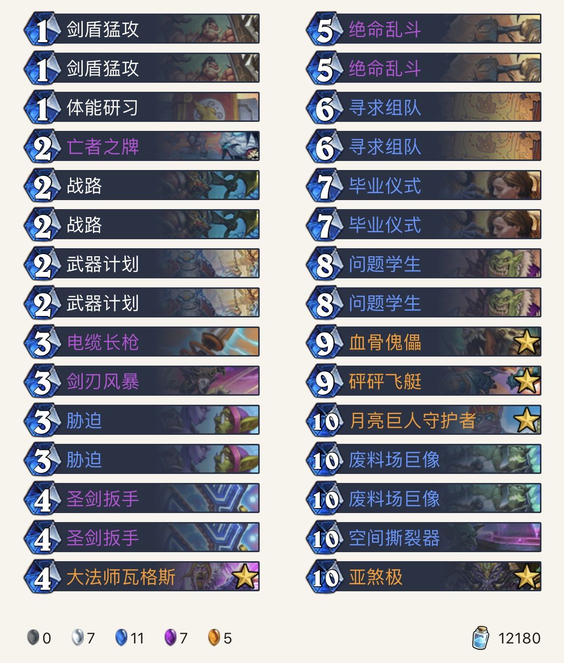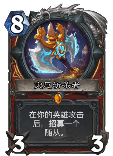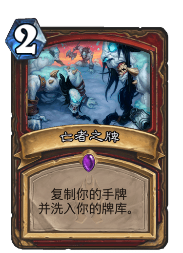 一个亮点,增加厚度的一张牌,在这个环境当中,几乎所有的对局对手都会把你给判断为海盗战或者无限战(奇数战),尤其当你第二回合叠甲过后,他们心中也基本都会认为你是无限战,在这种时候,你要是打了亡者之牌,那么对面基本就会确定你是无限战,从而赢得一定的信息差,这张牌通常在手中拥有一张以上的随从牌和招募牌时使用。