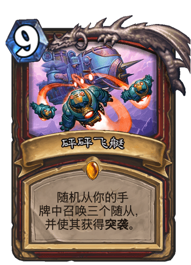 整套牌当中仅次于招募牌的核心,同时也是标准大哥战和狂野大哥战最大的差异所在,靠着这张牌在很多时候都可以逆转局势,直接翻盘。大哥战最大的最大缺点就是当大哥都上手时会非常卡手,哪怕是费用够了的情况下,裸拍大哥都非常亏费,而有了飞艇之后,不仅可以达成一回合内的霸道场面,更是让拍下去的几个大哥都具有突袭,能够解场,实在是很强,不过通常情况下都是在心中祈祷不要在九费前抽到。