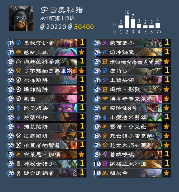 打法思路:前期看对面职业选择留牌,面对快攻找传统宇宙猎节奏卡,姐夫雷诺爆炸之类的。面对控制卡组,优先找难触发的奥秘,因为蒙面选手和土狼头领都要靠着奥秘打节奏,所以留牌很关键。起手关键牌要么是前期压场面的牌如1费的奥秘守护者和感知宝珠。要么就博学者普克尔特、实验体9号之类的节奏牌,越早进入这套宇奥猎滤完奥秘的回合,胜率越高,再加上中后期祖尔金三件套给的场面压力,基本能稳定胜局。——永恒狩猎丨雅痞