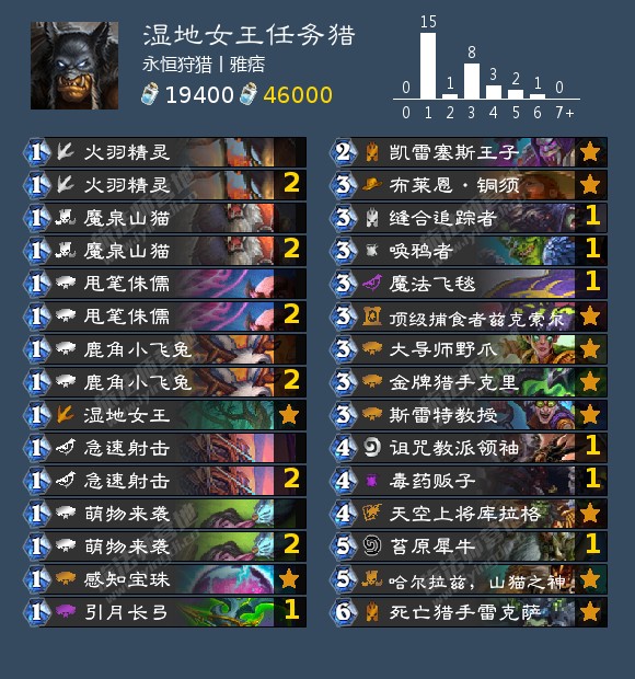 炉石传说2021湿地女王任务猎卡组玩法攻略是在于耍杂技,关键牌是帅逼侏儒,黑眼走了之后就被人遗忘了,但出乎意料的在任务体系里面发挥效果异常的好。首先是配合小费法术进行重复战场做任务,再有毒药贩子的情况下还能解各种场面。
