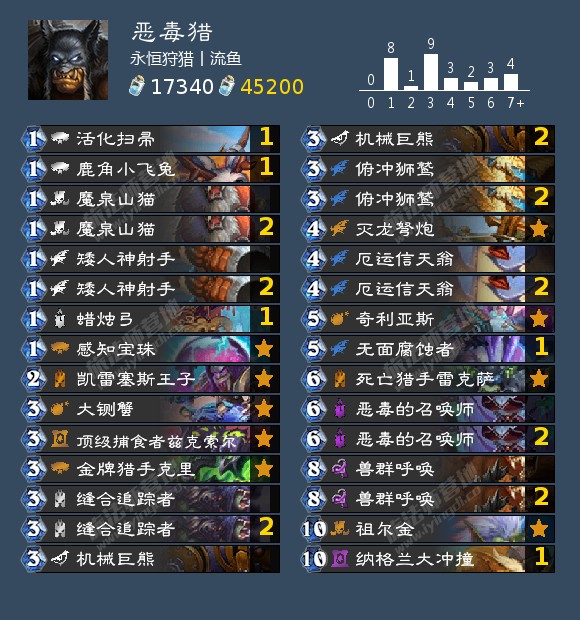 优质的随从是恶毒体系套牌的必要要求 失去了奥秘体系的恶毒猎在二费是比较尴尬的,几乎没有优质的随从,因此这里采取了直接用二王子填充二费的方法,所以经常二费射箭(二费射箭的猎人懂得都懂)。