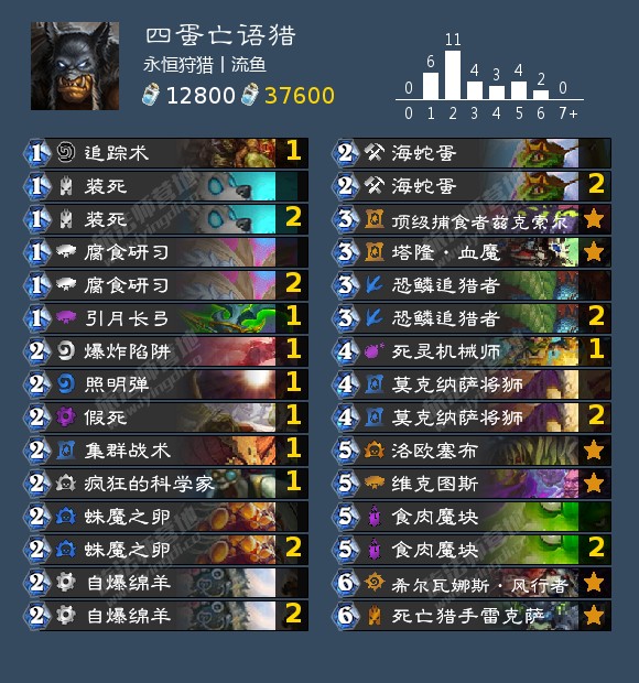 猎人的亡语体系一直是猎人相对比较稳定且优质的组件,无论是针对快攻,还是针对慢速。都可以通过改变单卡来实现。这套卡组偏中速,既有针对铺场型快攻的爆炸和绵羊也有针对慢速的女王和魔块。(说的就是你,魔块术!)