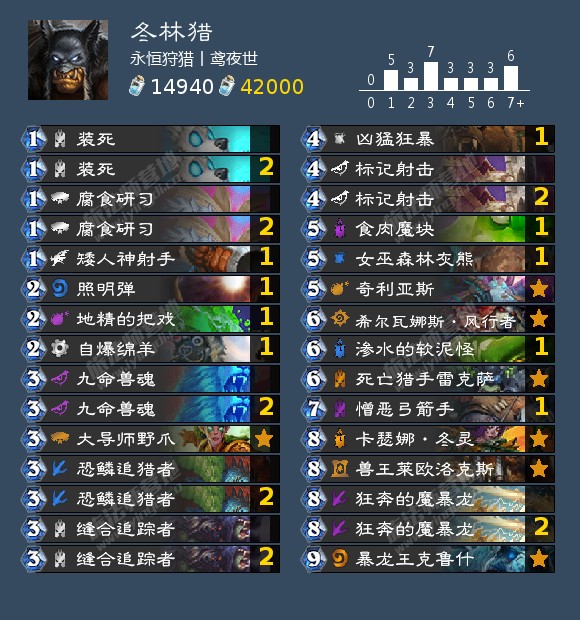 战——主要上分粮食之一,无限战奇数战,反正只要是叠甲的我们都欢迎,别来个天下第一就好。没有什么伤害,场面也不大的叠甲哥,是冬灵猎最好的朋友——不就是解场吗,你解就是了。起手往贪了找,双研习,冬灵装死,魔块九命,这些都可以;后手双研习五费硬币冬灵是最舒服的,这里小光头是怎么解都解不干净,大概率会留一个怪在场上,不出意外应该是冬灵亡语掉出来的野兽,然后就是有魔块下魔块有狂暴打狂暴,怎么贪怎么来就好了。冬灵猎在厚度上并不太怕鸡战,就是有一点要注意,铜须双鱼,容易一波疲劳直接抽死。而海盗战,先不说目前天梯上有没有,有估计也就一两个,实在不行遇到跑了就是了,反正咱是娱乐卡组,干嘛跟他个天下第一打架;不过我是没见过就是了。