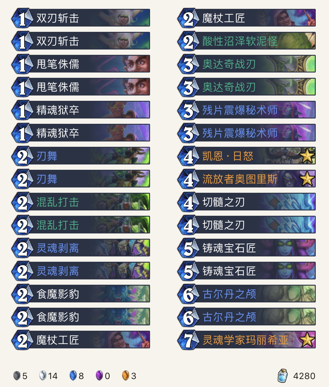 老强度卡组了,从版本初配大家走到了版本末,一套综合能非常强的卡组,基本天梯主流卡组都有一战之力。对战T7猎有非常大的优势,在打牧师这种苟活能力强的职业也因为中期极强的爆发显得不落下峰。月末上分强力推荐!